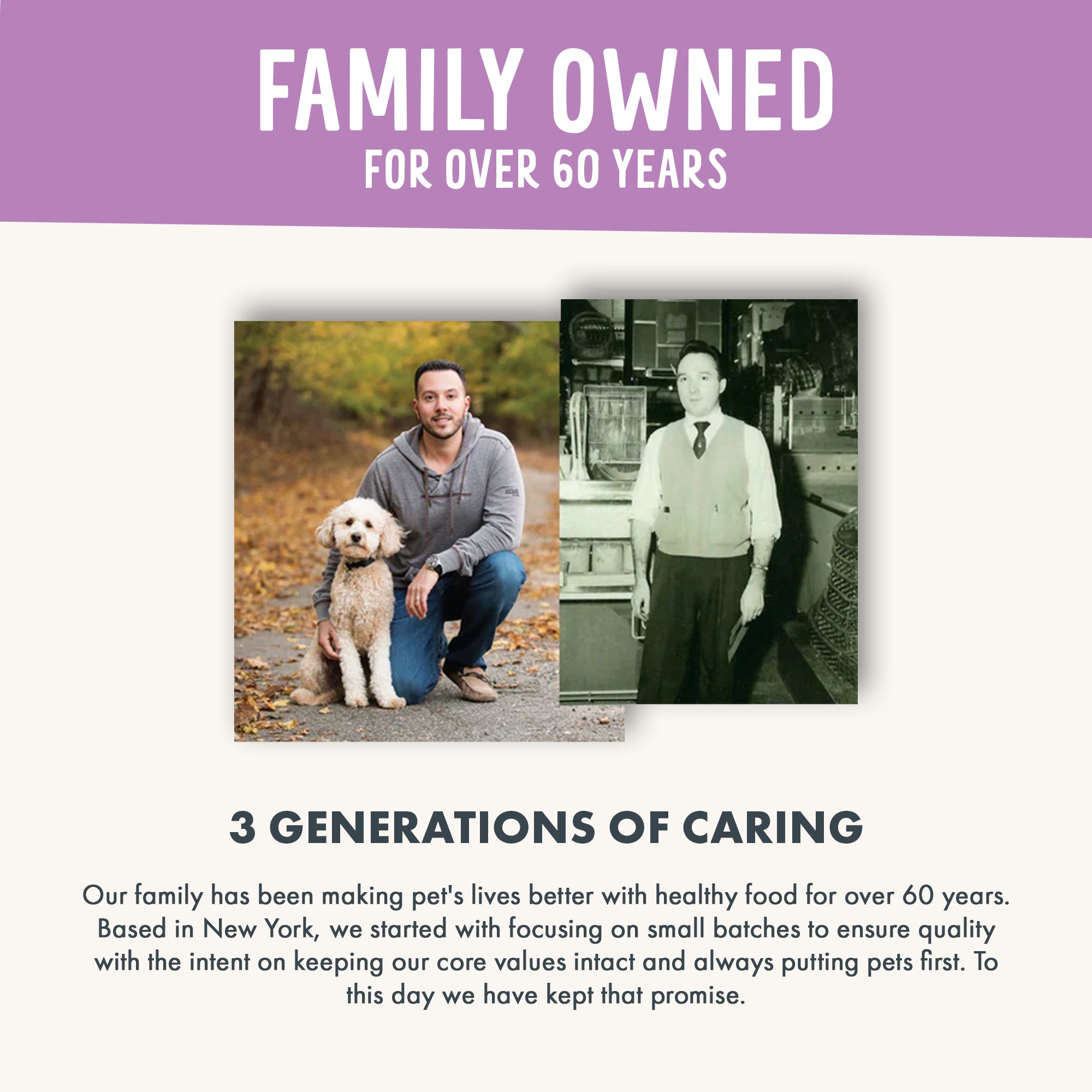 For three generations, our family has been dedicated to making pets' lives better with healthy, high-quality food. Based in New York, we’ve stayed true to our roots by crafting small-batch recipes to ensure excellence and maintain our commitment to pets’ well-being. Our core values of care and quality have remained intact, and we continue to prioritize what matters most: happy and healthy pets.