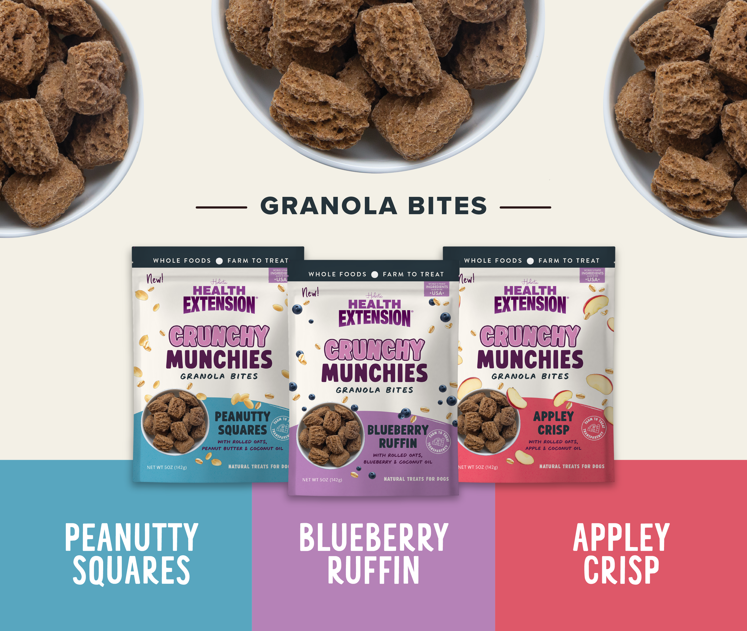 Treat your furry friend to Health Extension's Crunchy Munchies! These delicious, wholesome snacks are crafted with rolled oats and nutritious ingredients like peanut butter, apples, blueberries, and coconut oil. Available in three irresistible flavors: Peanutty Squares, Blueberry Ruffin, and Appley Crisp. Perfect for rewarding your pet while supporting their health and happiness. Natural treats, farm-to-treat quality!