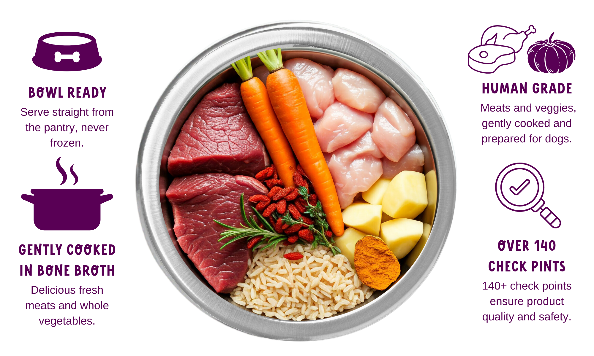 Digestive Health: Our slow-cooked dog food in wholesome bone broth promotes digestion, ideal for sensitive tummies.