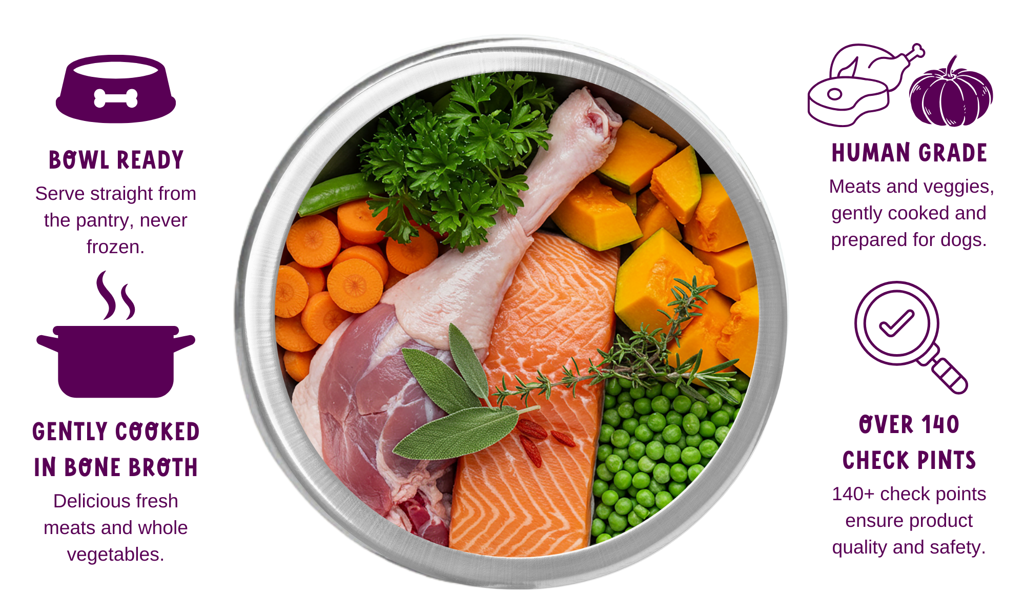 Fresh meats, whole vegetables and powerful superfoods, cooked in bone broth.